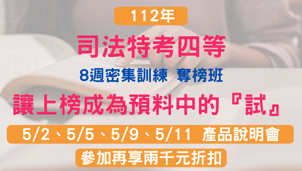 112年司法特考-四等奪榜班5/31前限時優惠,參加說明會再享千元折扣
