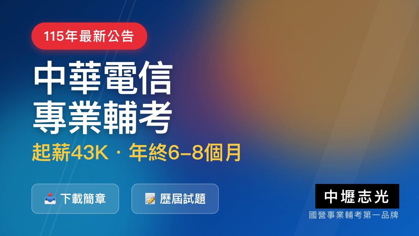 【115年中華電信招考懶人包】最新簡章公告!工務類起薪破5萬,年薪平均16.6~18個月。報名至2/2截止,筆試3/14。本頁提供電信線路、行銷業務缺額分析與口試體測重點,助您擠進電信龍頭!