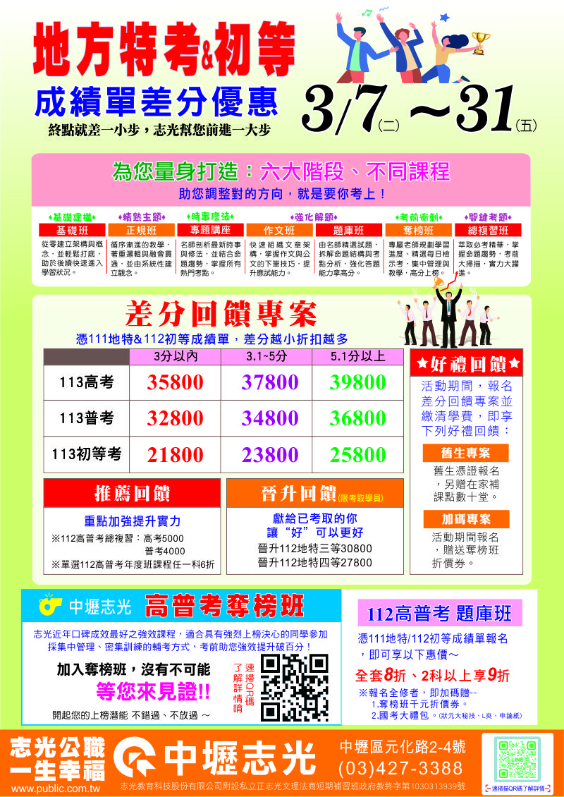 3月是專屬於公職考試的月份,3/7地方政府特考放榜、3/14~3/23高普考報名,整個月都精采!志光準備歡慶一整個月!報名公職高普考課程全面萬元優惠,113年基礎架構班全面開課中,目標113年考取公務員!