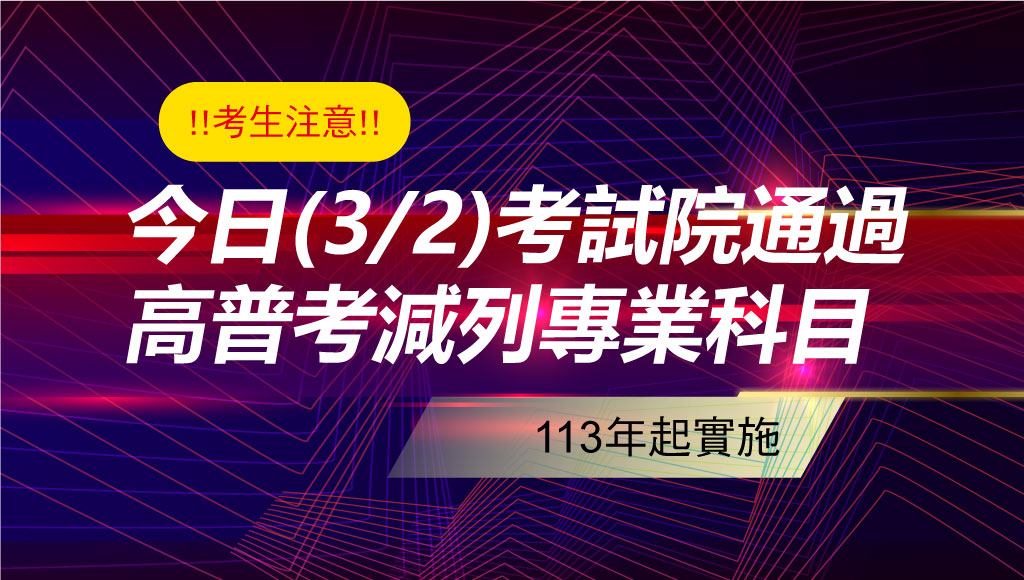 考試院通過高普考減列專業科目 113年起實施,這次修正高考三級考試以減列2科、普考減列1科為原則,想準備考試的你,這是一個非常好的機會,快來看看調整的內容及方向說明。