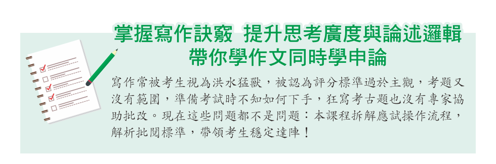 上了這門課,你可以得到四大能力!『多元題型應對』『考題趨勢掌握』『寫作材料豐富』『提升寫作見識』