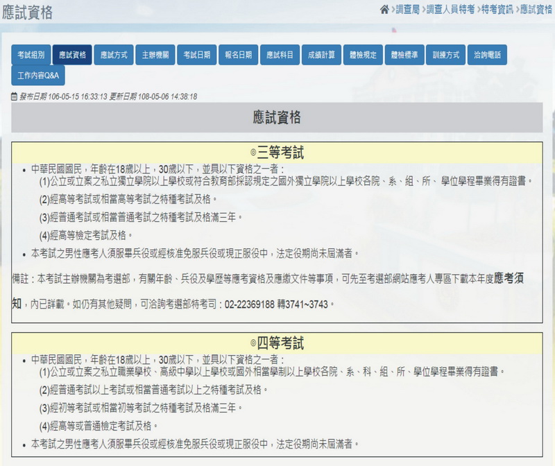 1.三等考試:錄取人員將委由法務部調查局(幹部訓練所)訓練一年;訓練期間,比照委任第五職等本俸五級俸額標準發給津貼。 2.四等考試:錄取人員將委由法務部調查局(幹部訓練所)訓練半年;訓練期間,比照委任第三職等本俸一級俸額標準發給津貼。 |