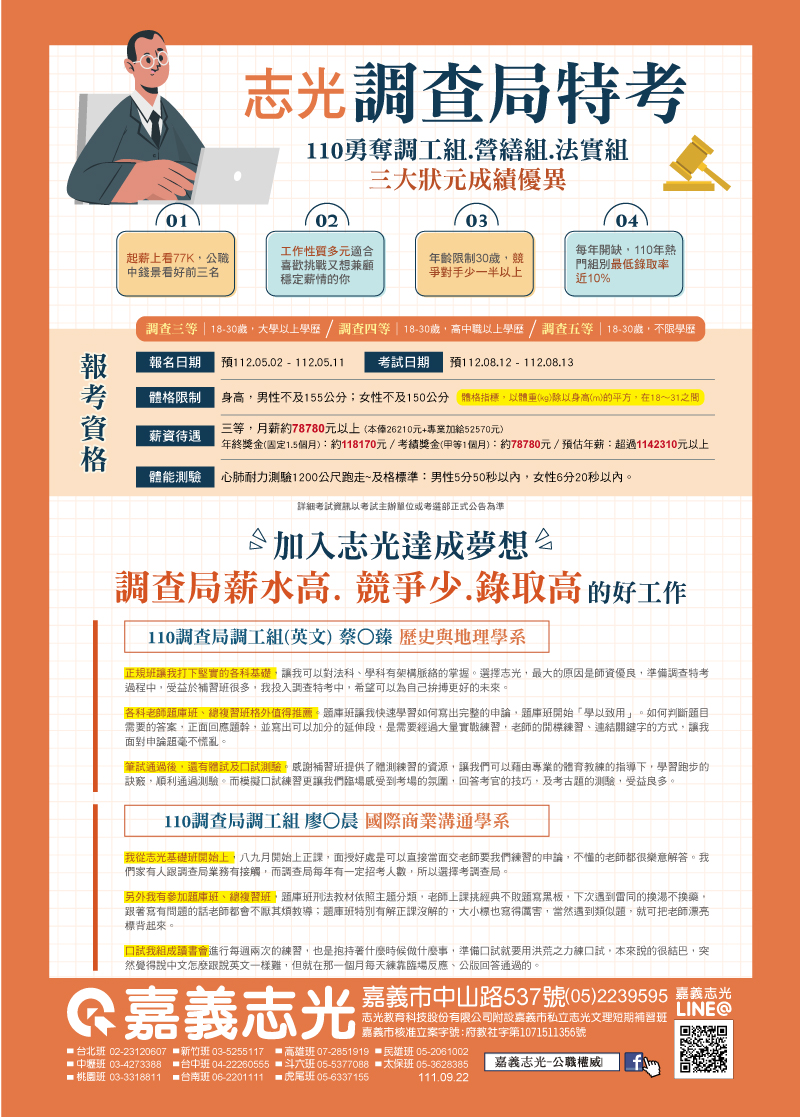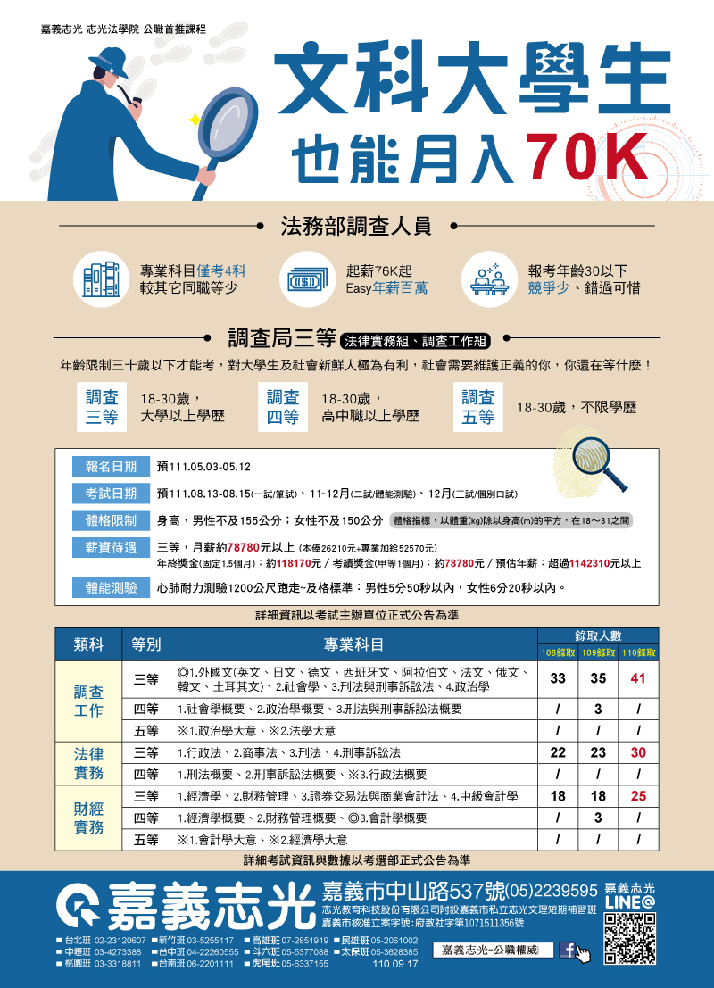 法律系/財經法律系/政治系/犯罪防治系/外文系/社科院....大學畢業生考調查局!月薪近8萬 頂尖公務員,適合充滿理想、有抱負的(妳)你Go~2021-111調查局 新班~考上MJIB,展抱山莊一去受訓 Go