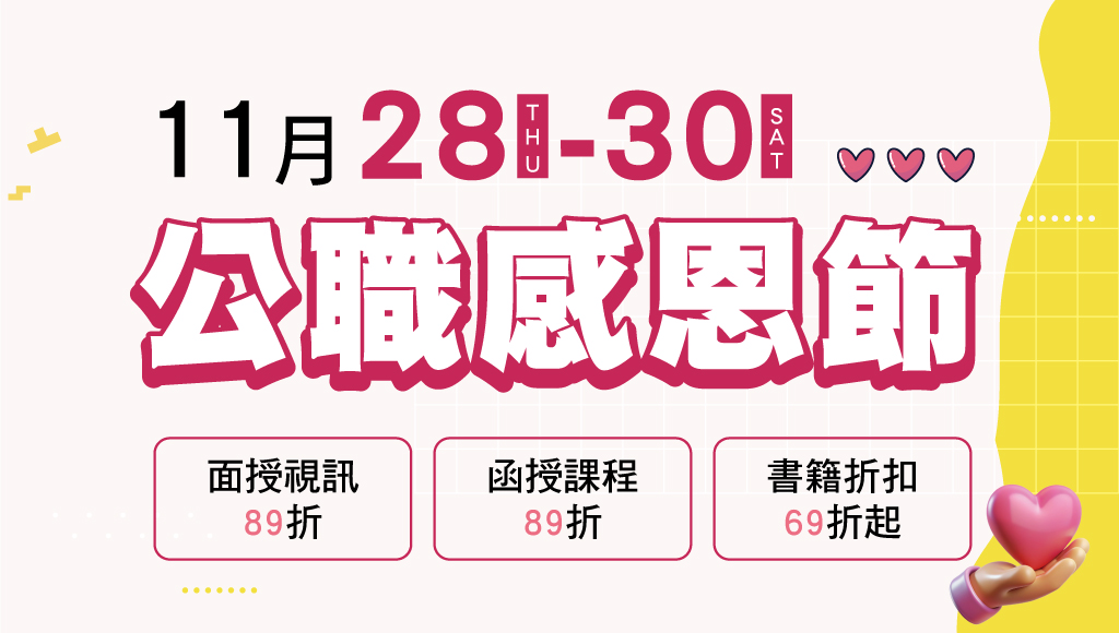 【11/28~11/30】 公職感恩節 面授/視訊/函授89折起,學費繳清最高可再折1000元,超級優惠,千萬別錯過!!!