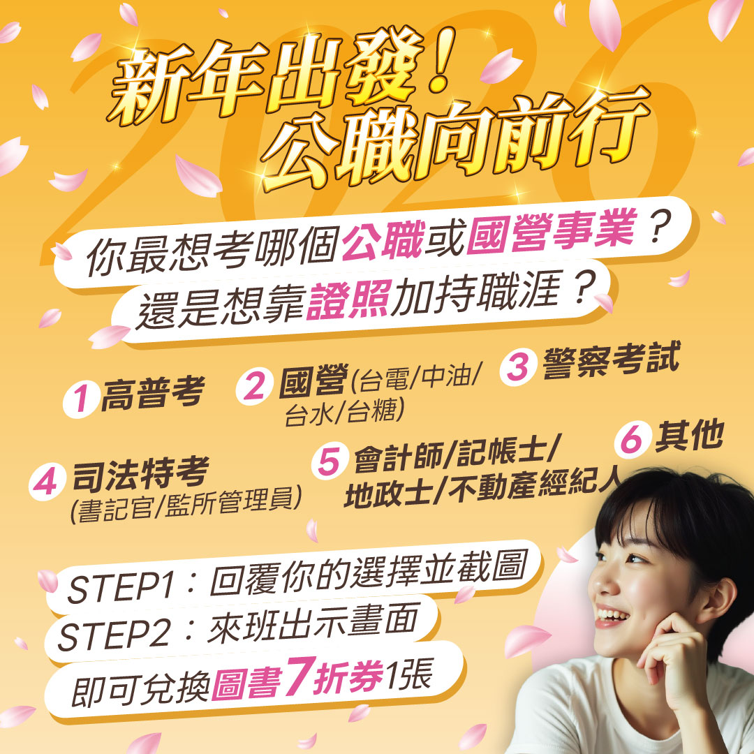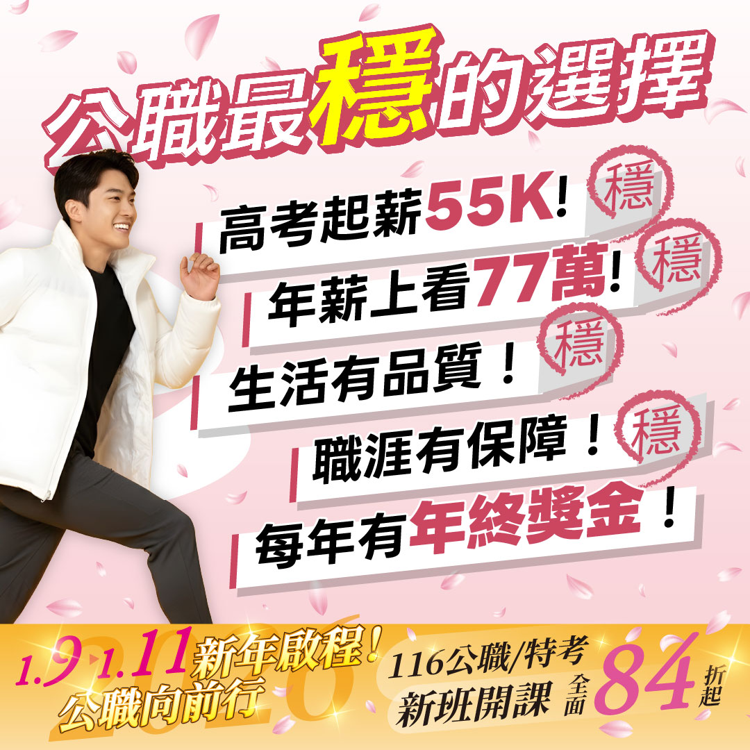 1/9-1/11新年起程 公職向前行,2026新年新希望,轉職第一選擇 穩定幸福,給正在努力準備的你 ,116年公職新班開課 84折起,115年短期衝刺班最高再折 6,000 元,公職,不只是穩定工作 而是一份能讓未來安心、讓努力有回報的選擇 今年最後一個檔期,替明年的自己先鋪好路