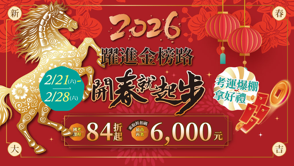 2/14-2/28開春就起步,好課84折起/證照66折起,116年公職新班開課84折起,115年短期衝刺班最高再折 6,000 元
