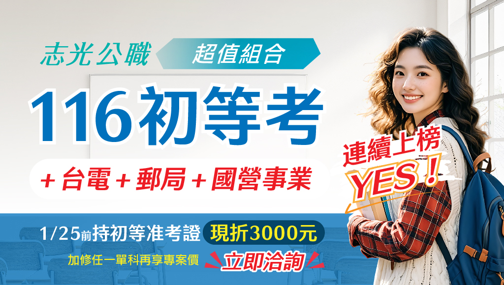 ※推薦原因:這個組合原先三個考試都可以考之外,也能考台電僱員-綜合行政or其它國營事業,多準備1科就有2次以上榜機會,這個投資絕對划算!