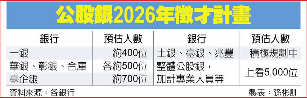公股銀行積極規劃明年度徵才計畫,整體規劃上看5,000人,其中,第一銀行規劃招募約400位職缺、華南銀行預計徵才約500位、彰化銀行預計招募約500位、臺灣企銀規劃進用約700位,合庫銀行預計約500位,土地銀行、臺灣銀行、兆豐銀行等積極規劃中,加計專業人員等職缺,預計全部公股銀徵才人數上看5,000人。