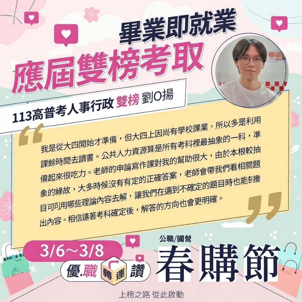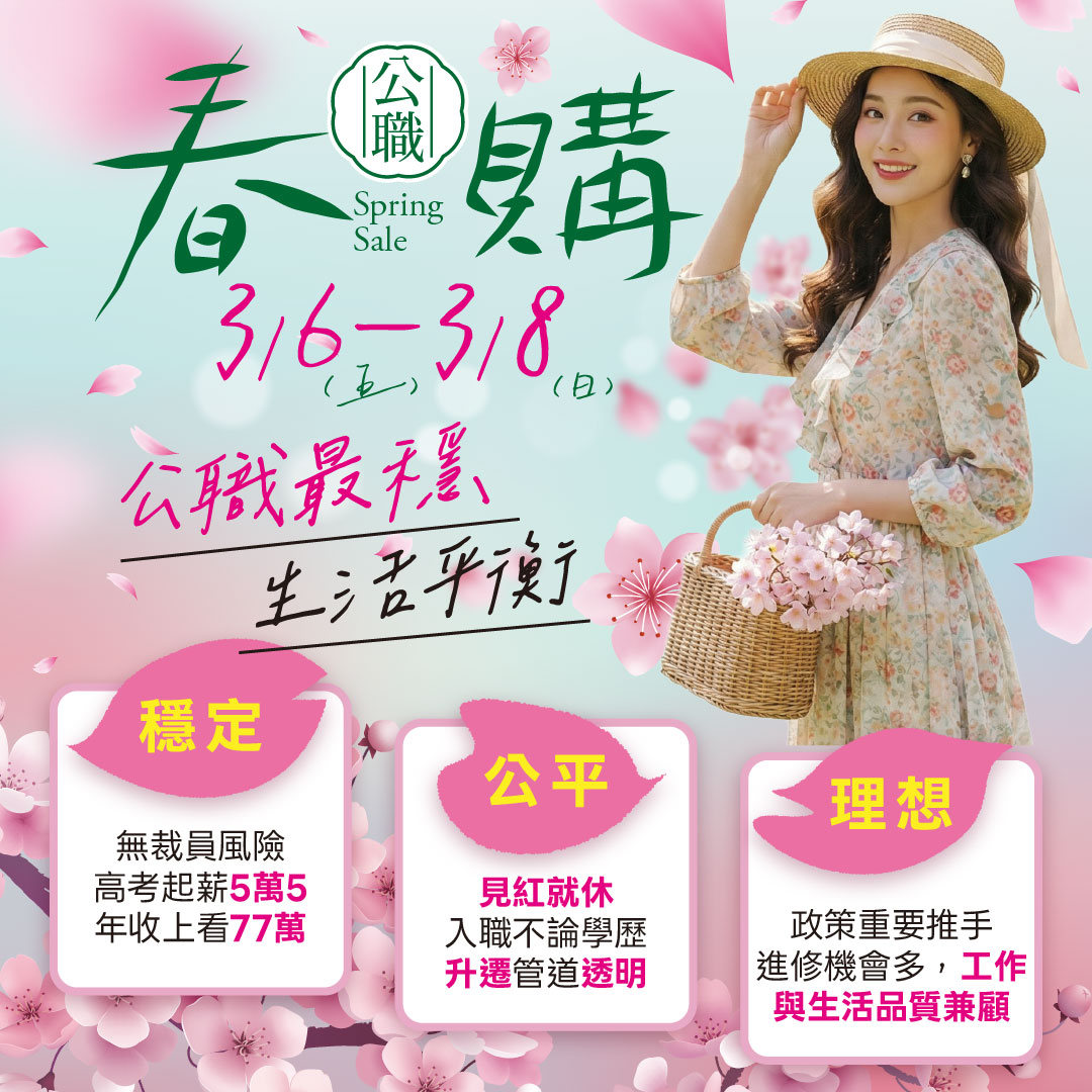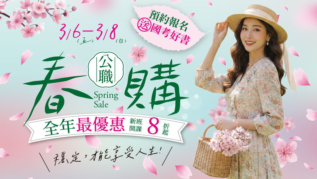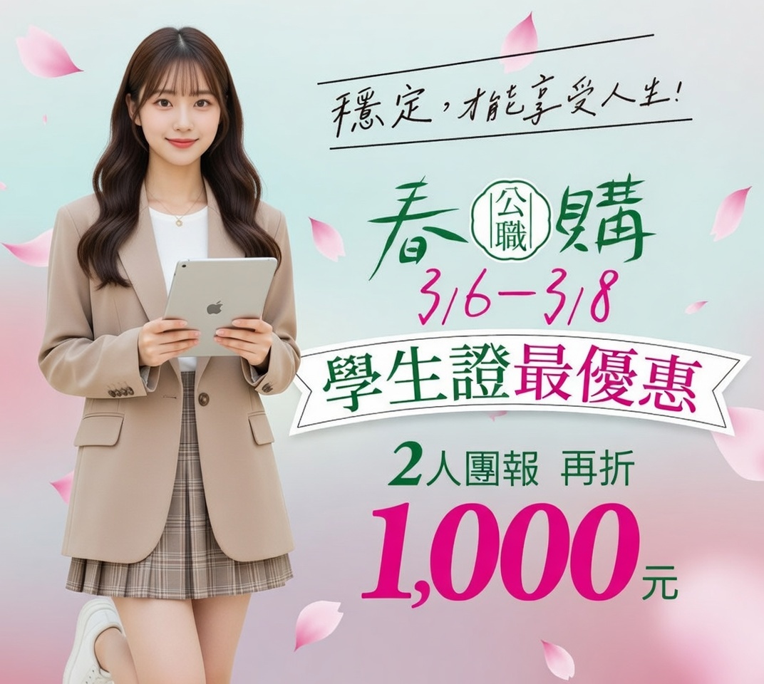 3月春購節狂歡開跑!加入官方LINE索取門市折扣碼。36–3/8限時優惠,國考課程折扣8折起,適用高普考、司法、警察、國營等熱門類科,高雄學儒提供專人諮詢。