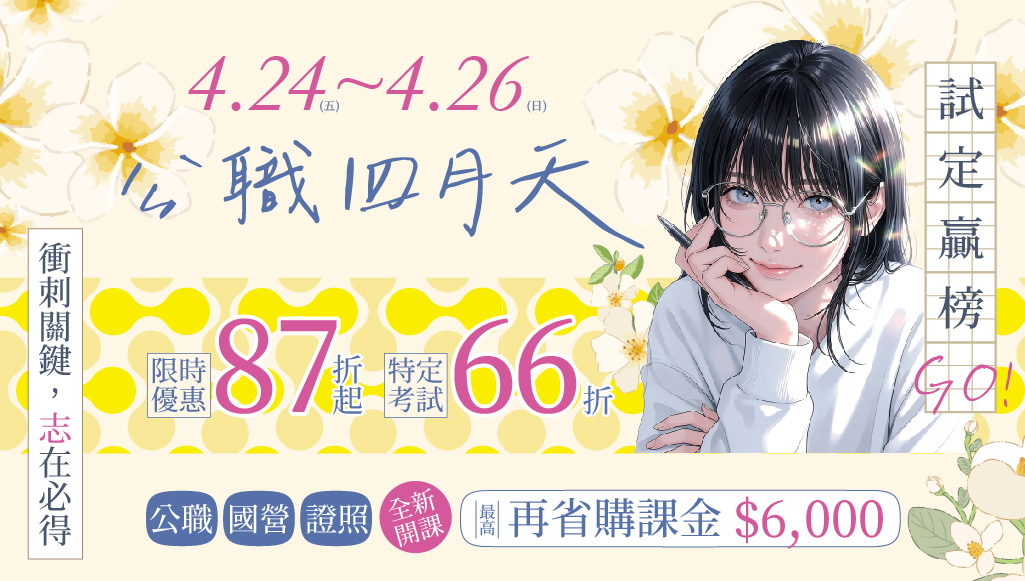 公職四月天|全面87折起|2026年轉職開始!加入官方LINE索取門市折扣碼。4/24~4/26限時優惠,國考課程折扣87折起,適用高普考、司法、警察、國營等熱門類科,高雄志光提供專人諮詢。