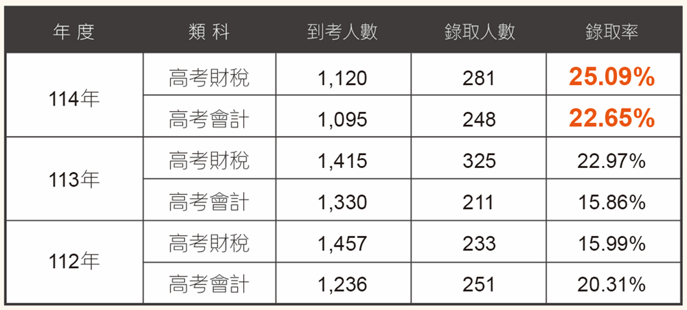 財稅行政與會計屬於穩定、長期招考的公職職系。以下用資訊卡方式整理近年指標: