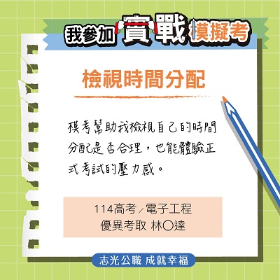 實際模擬考選部考試時間,讓同學可以透過實戰模考,了解自身程度及待加強地方,即時調整讀書狀態及方向!
