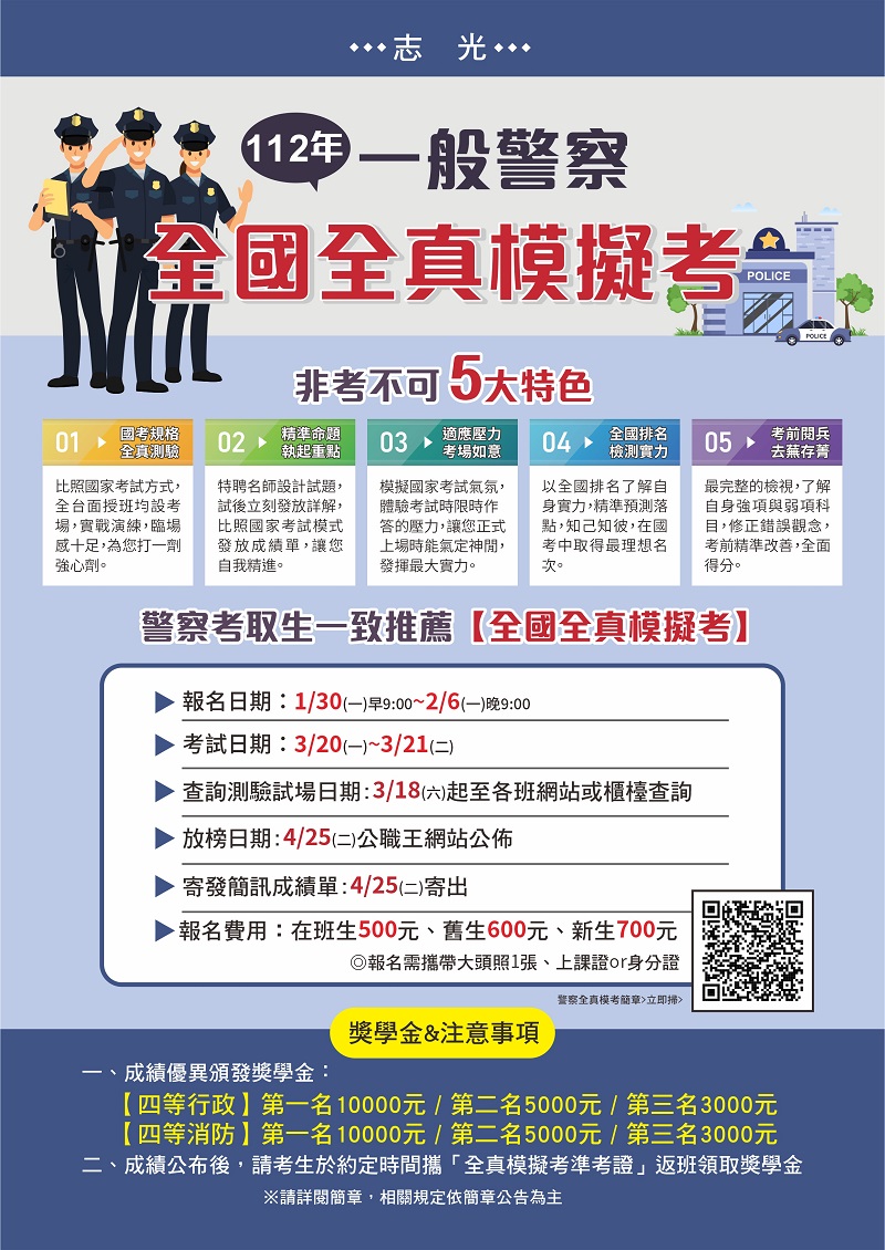 112年一般警察特考模考,檢視考前應考實力,訓練考試臨場反應力,全程模擬一般警察考試,比照一般警察考試時程,模擬考場實戰氣氛。讓學生瞭解對題目的認知、審題、答題邏輯及準備程度等。幫助同學設定短期目標及未來國考路上的時間規劃。高雄志光 112年度一般警察特考【全國模擬考】