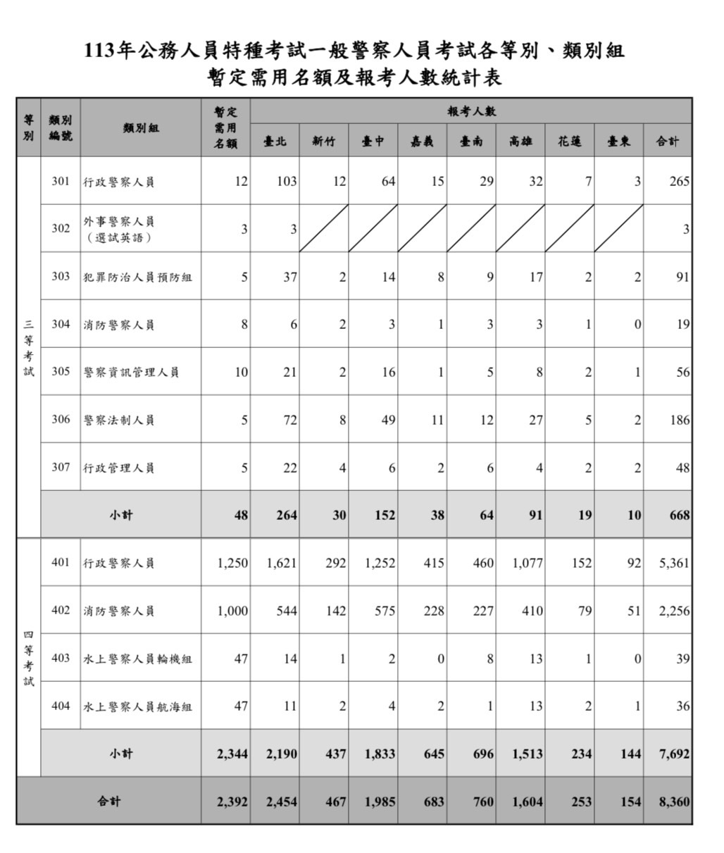 113年公務人員特種一般警察人員考試各等別暫定需用名額及報考人數統計表