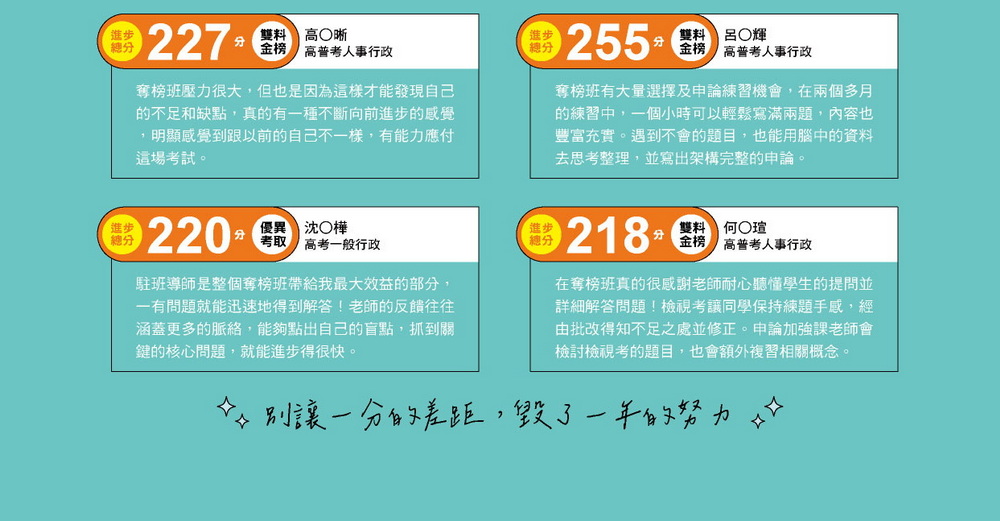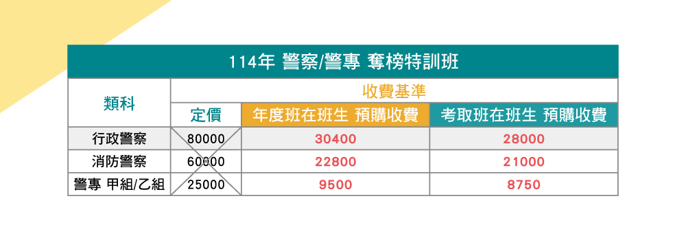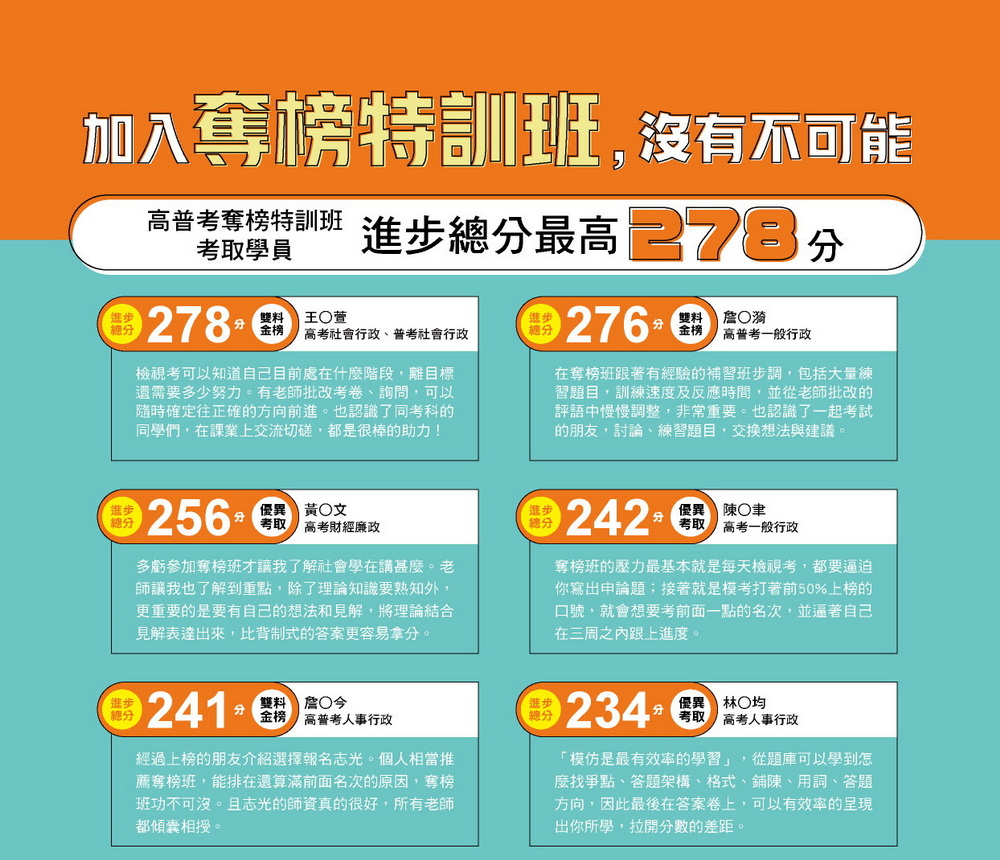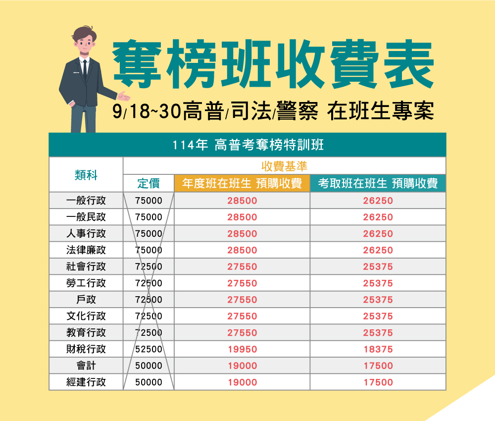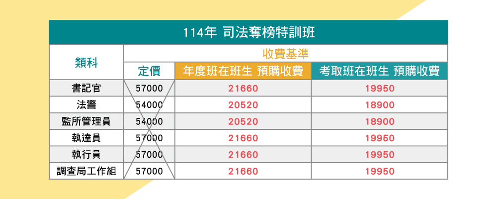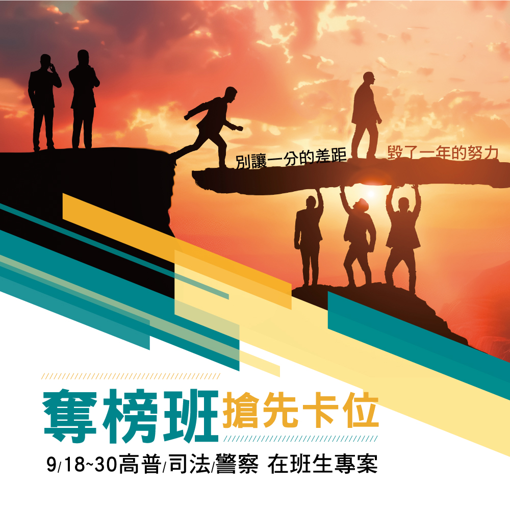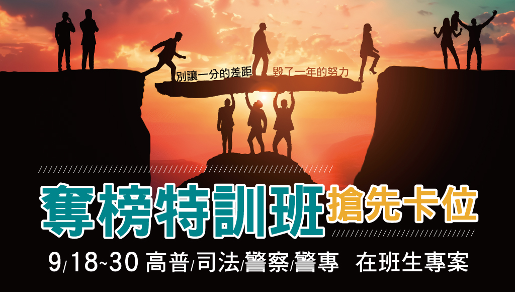 114高普考/ 司法 / 警察奪榜特訓班搶先預約卡位,每年奪榜特訓班的錄取率遠遠高過於其他同業,現在我們提供一個讓在班生提早報名且更優惠的報名機會。