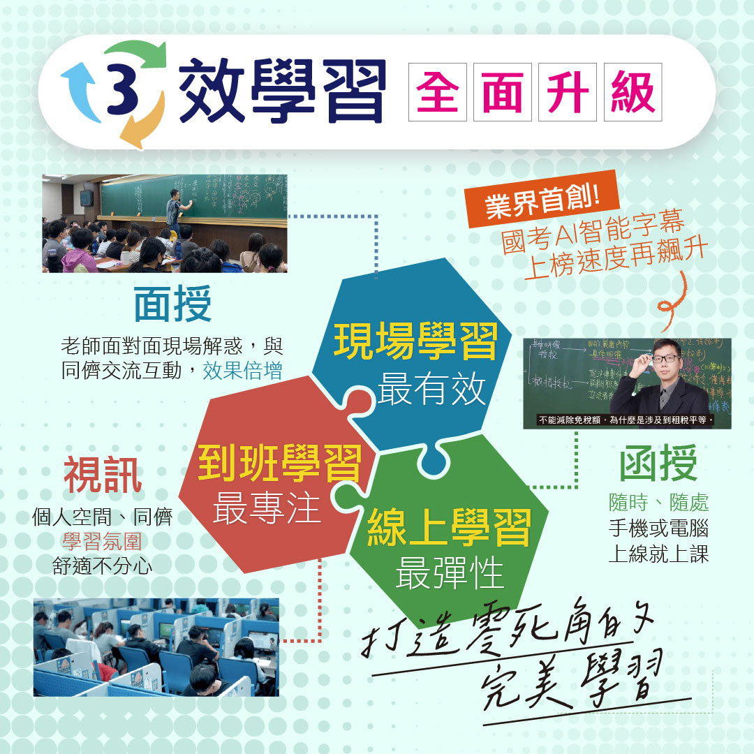 集結所有學習路徑優點:面授補強弱科互動、視訊到班穩定節奏、函授彈性學習。 適合追求最高學習效率,全方位資源支持考生。