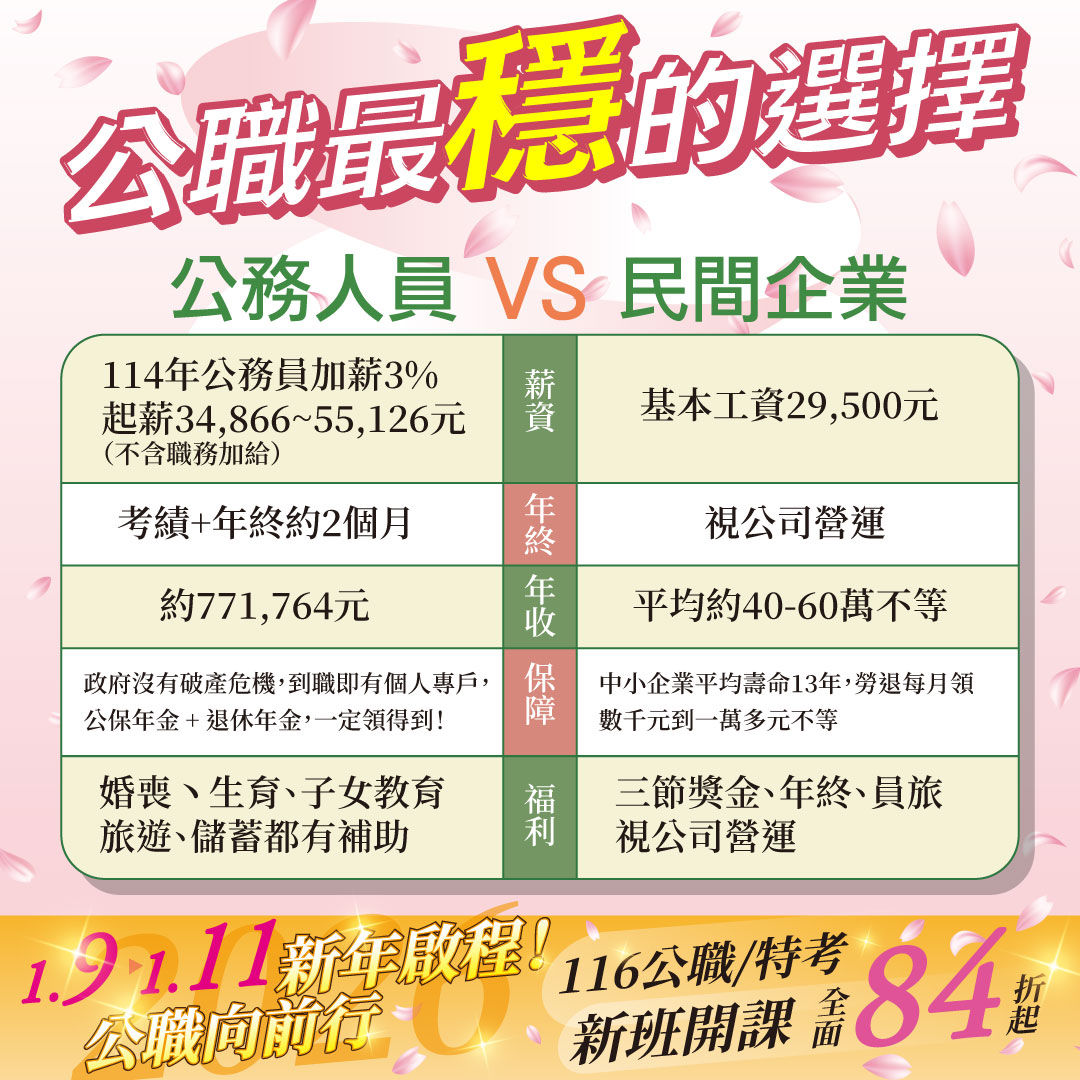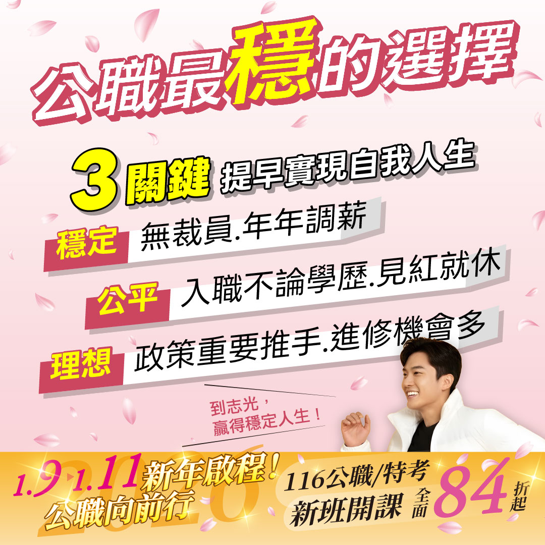 志光學儒【1/9~1/11新年啟程、公職向前行】好課84折起/證照66折起,公務人員工作穩定、起薪高、年年調薪、新制退休制度優渥,加上5年退休潮,現在將是您前進公職的最佳時機!