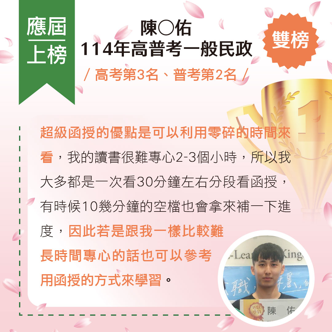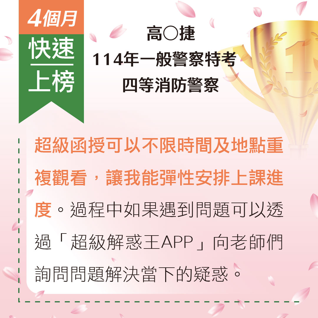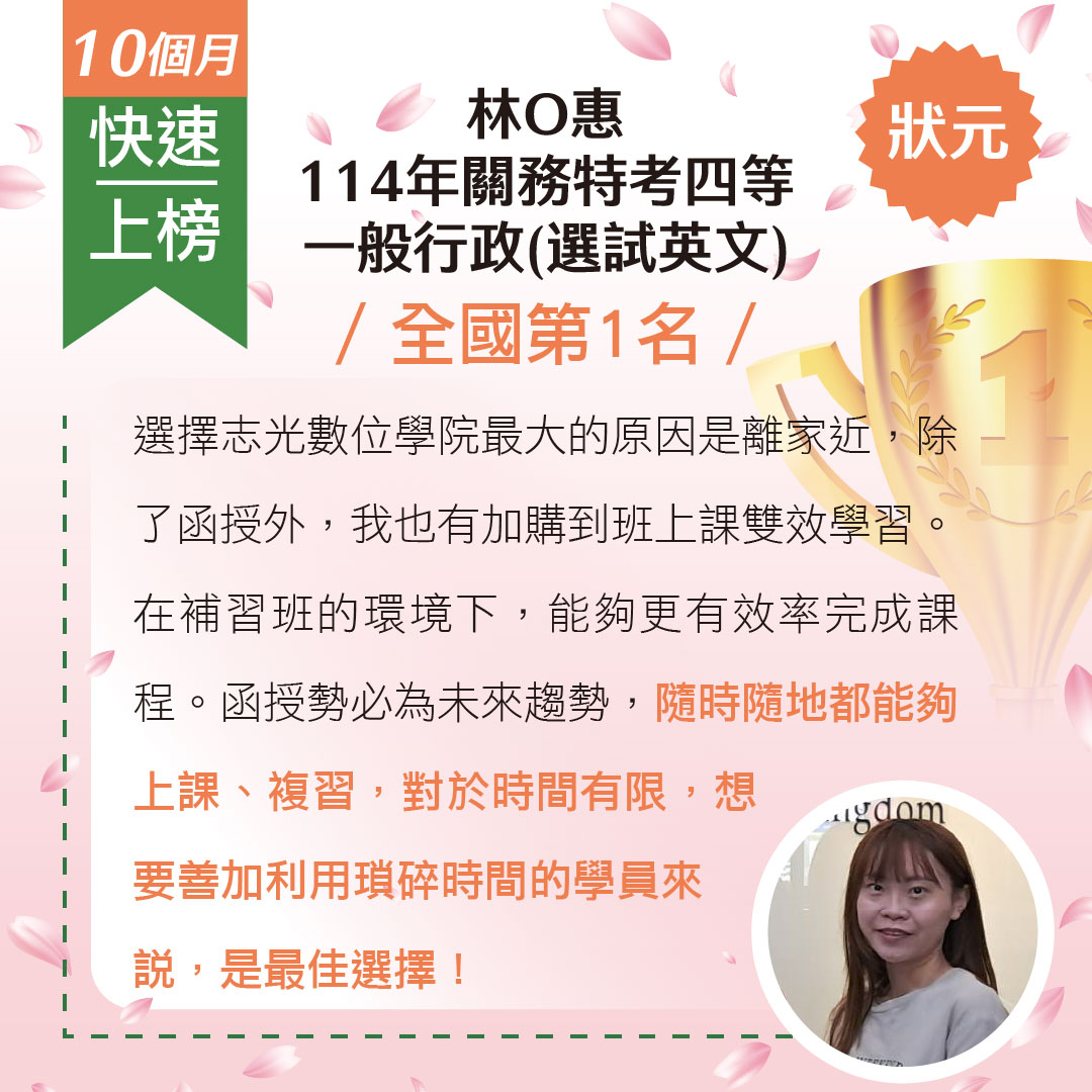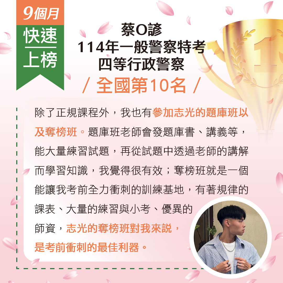 標籤: 高考(三級) 普考 初等考 司法特考-三等 教師檢定 一般警察-四等 教師甄試 地方政府特考-三等 地方政府特考-四等 郵局專業職(二) 專技高考 專技普考 國營事業聯招新進人員 警專 司法特考-五等 司法特考-四等 台電新進僱員 行政警察人員 消防警察人員