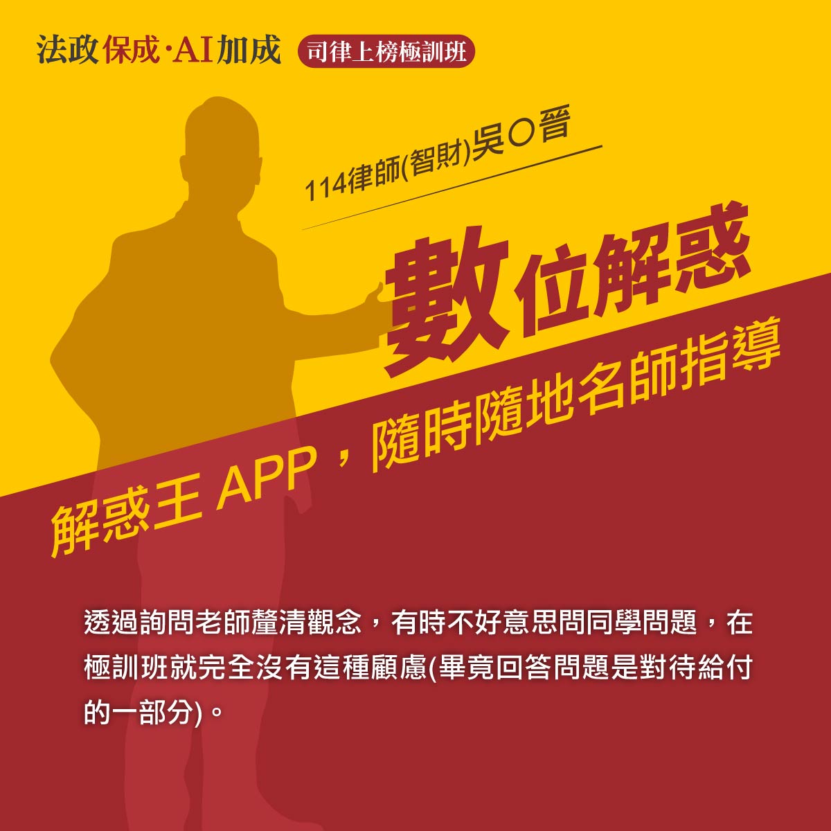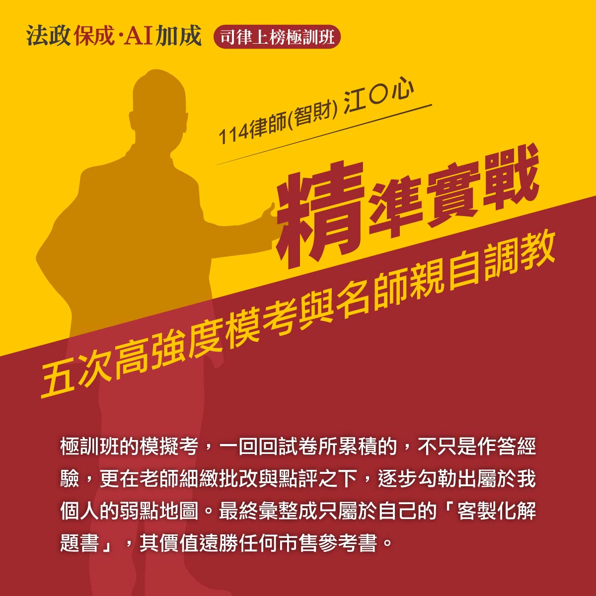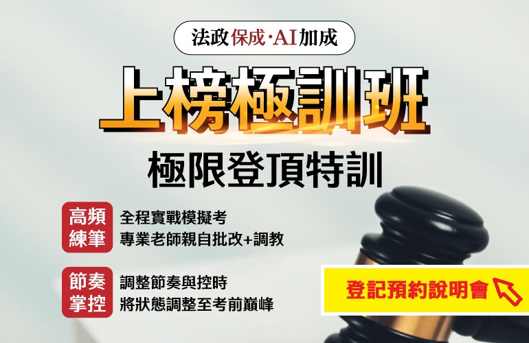 2026 司律上榜極訓班提供一試、二試共五階段擬真模考,由名師親自閱卷並精準診斷痛點。線上極訓彈性又便利,結合解惑王APP與全面啟動115年新制「電腦化測驗與紙筆作答」提前熟悉電腦化測驗,助你考前潛能大開發,順利上榜!