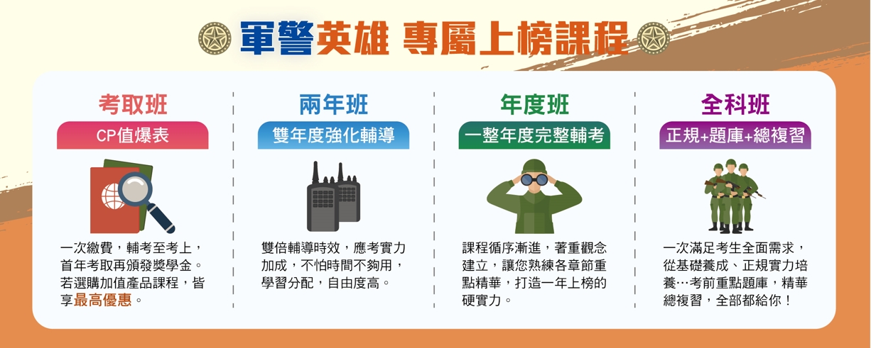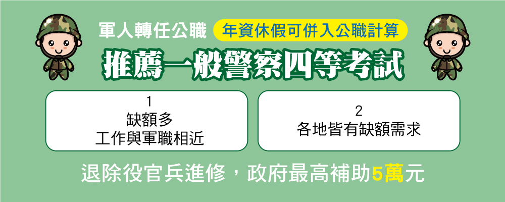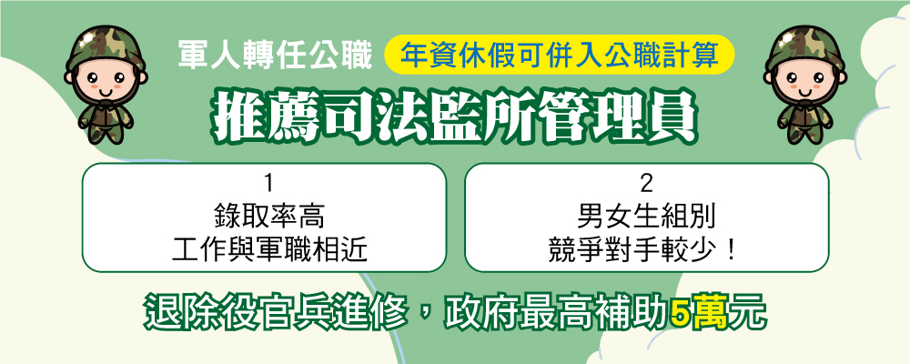 標籤: 高考三級 普考 初等考 退伍 司法特考三等 司法特考四等 一般警察四等 監所管理員 職業軍人 職軍 退除役 退除役特考三等 退除役特考四等 軍人 軍職