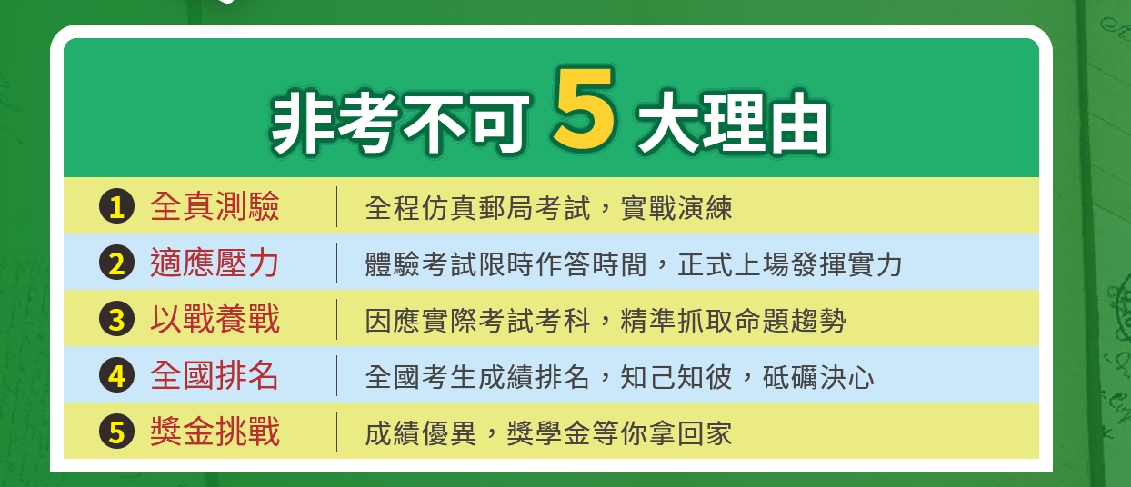 全國志光系列舉辦郵局模擬考,請各界專業老師全新出題,讓考生在郵局招考前有一次完整的模擬練習,提早發現自身弱科並改進!