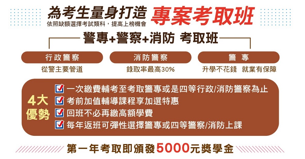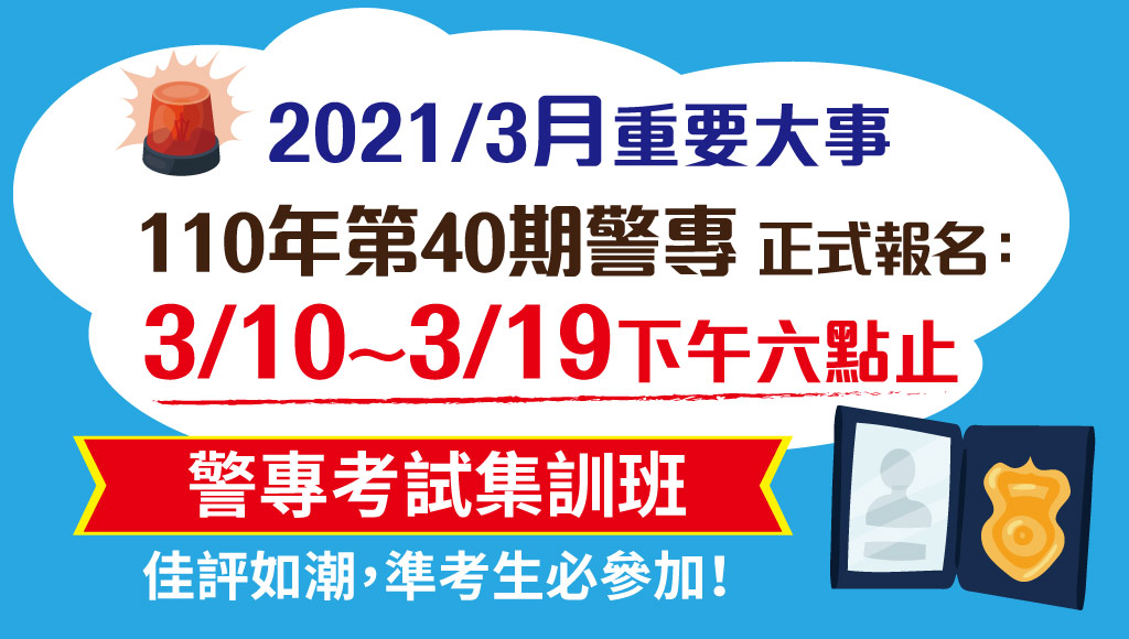 110年第40期警專正式報名,3/10~3/19期間報名各項課程享限定優惠。(內含警專招生簡章、歷屆試題下載、正式報名流程說明)