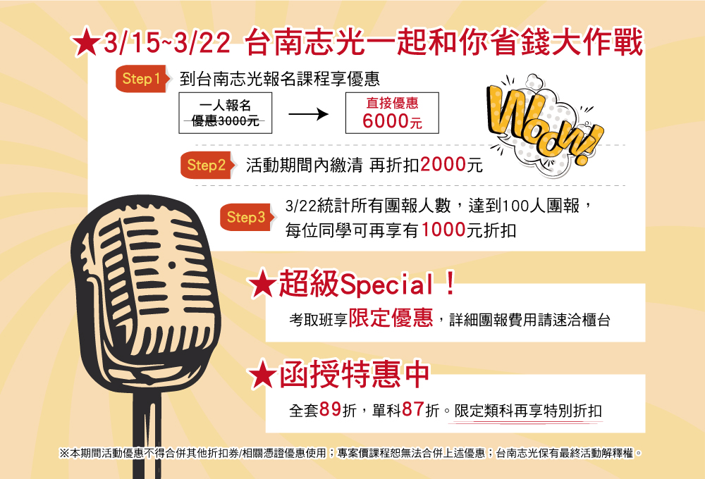 110/3/15~3/20 正式報名,請至台南志光櫃台報名。