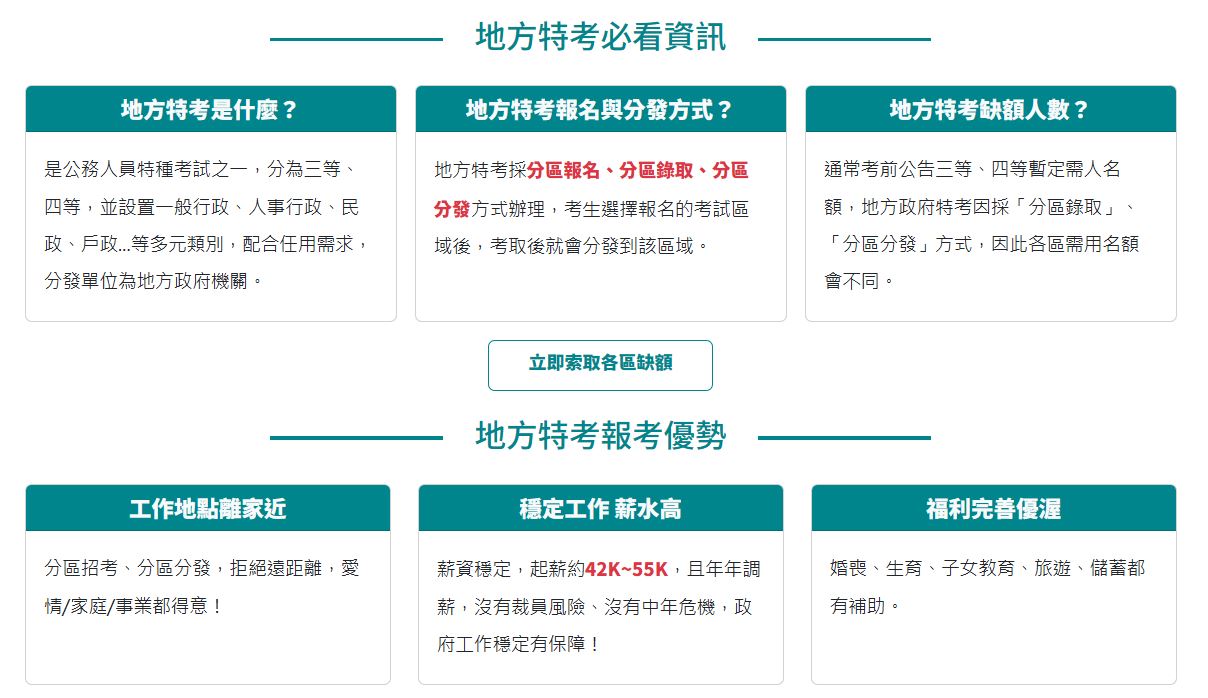 地方政府特考約每年9月報名、12月考試,地特放榜則為隔年的2-3月,地特等別主要以三等、四等為主,並各設置一般行政等科別,配合任用需求,每年舉辦不同類之考試,採分區錄取、分區分發方式辦理,主要分發單位為地方機關。