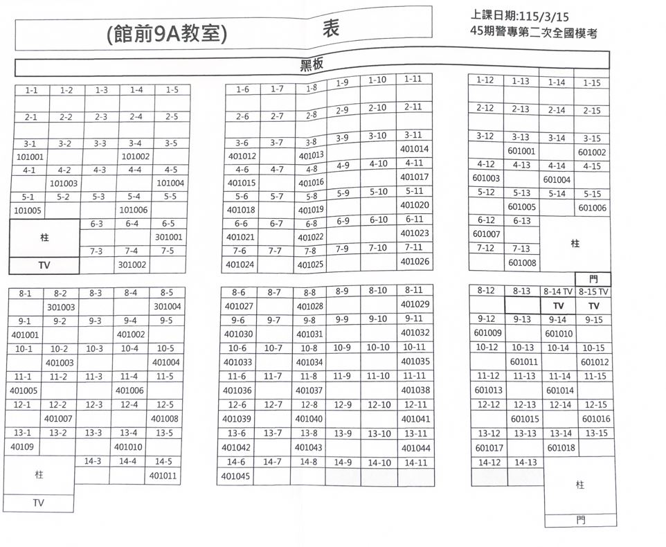 45期警專第二次全國模擬考座位表 一、地點:館9A(台北市中正區館前路2號9樓) 二、考試日期:115/03/15(日) 三、考試日程: 四、考場座位表: