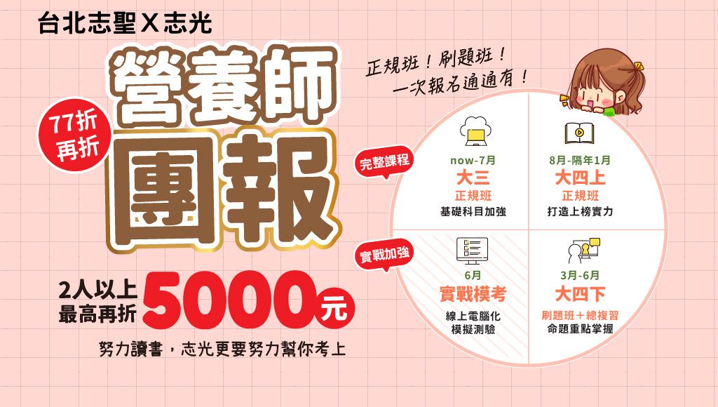 加入台北志聖+志光營養師線上課程,名師系統教學、重點整理一次到位,幫你有效衝刺考試高分。適合在學與在職考生,彈性上課、快速備考,現在報名立即開始準備!