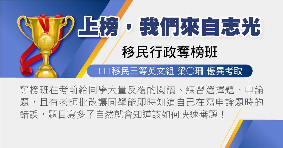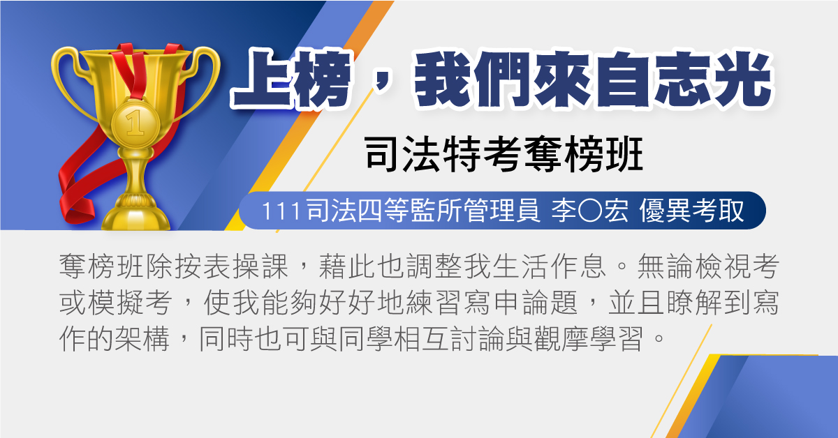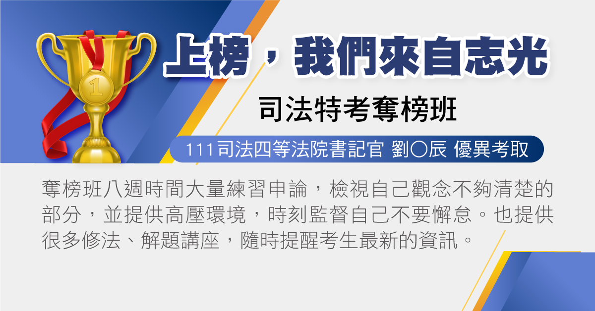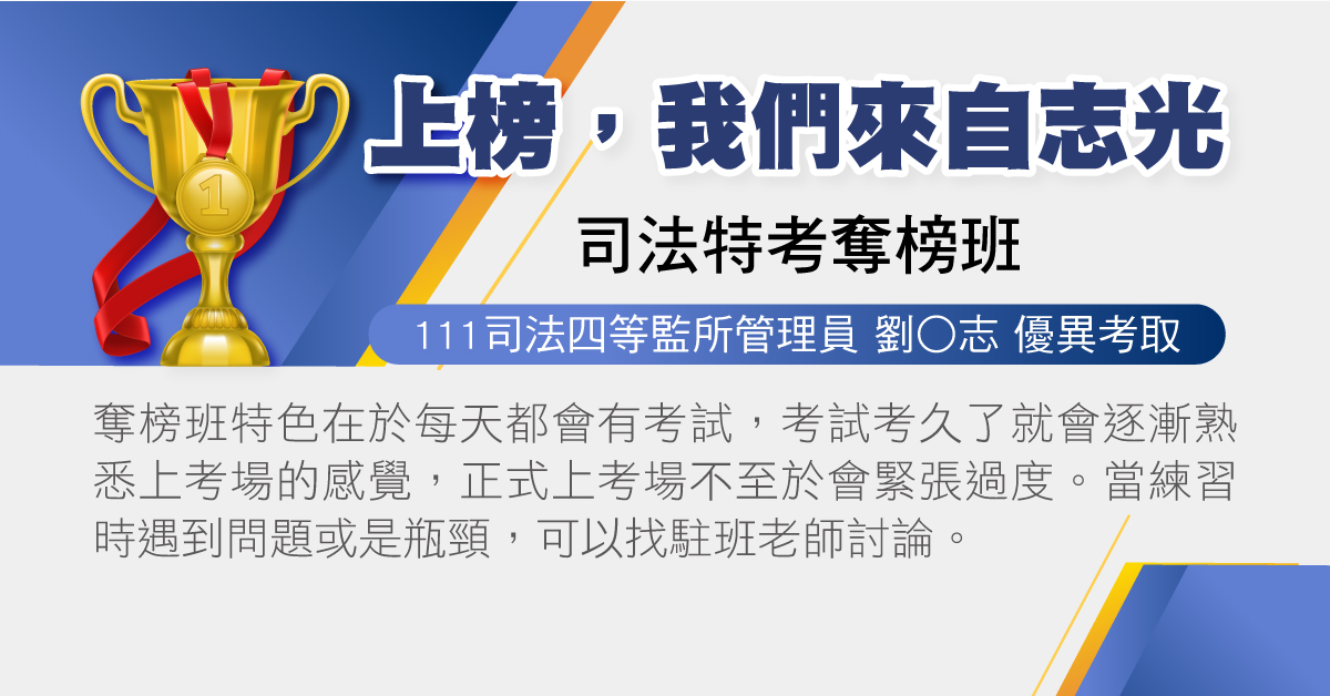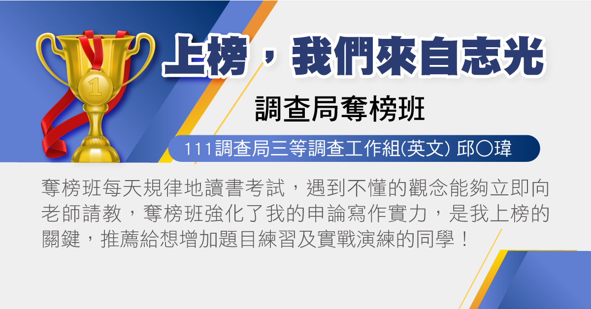 今年我有參加奪榜班,去年以0.8分之差飲恨,在詢問其他上榜同學經驗後後,才知道志光有這個班可以參加,很多考上的同學都有報名,因此下定決心屆時要來到這和高手們互相激勵彼此!